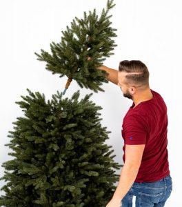Gałązki są przymocowane bezpośrednio do pnia choinki, dlatego należy je ręcznie rozłożyć do kąta 90°. Zaczynamy od najniższego rzędu i upewniamy się, że wszystkie gałązki zostały rozłożone. Podczas rozkładania należy zadbać o równomierne odstępy między gałązkami. Dopiero potem przystępujemy do układania i modelowania igliwia.