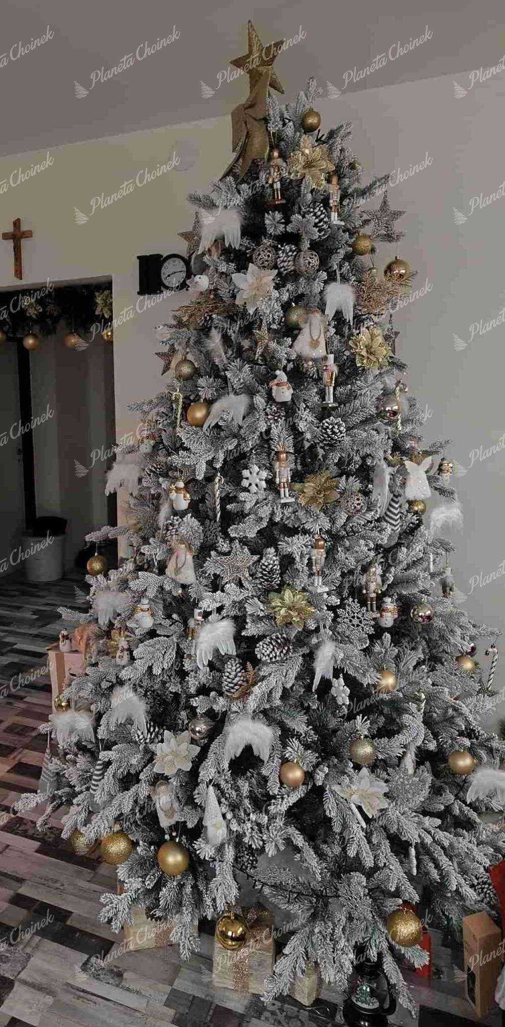 Choinka sztuczna biała jak żywa PE, wysokość 240 cm, szerokość 145 cm, typ igliwia – PE + PVC, wykonanie – ekstra gęste, długość czubka – 20 cm, stojak metalowy, liczba części – 3
