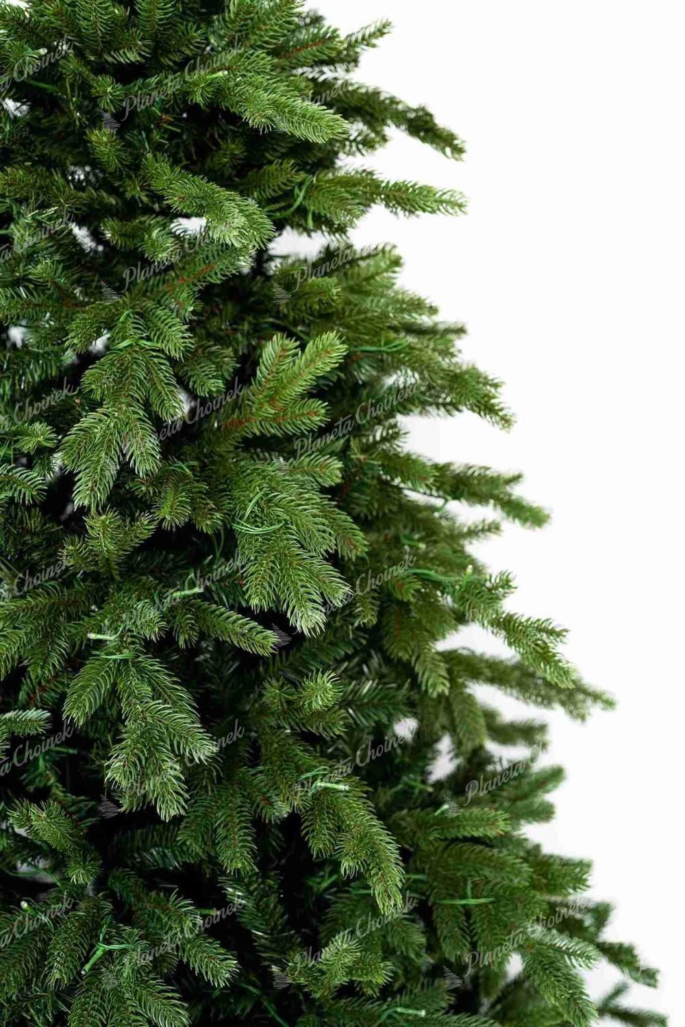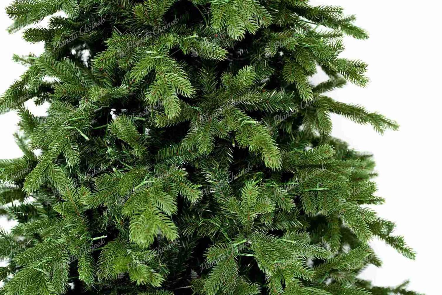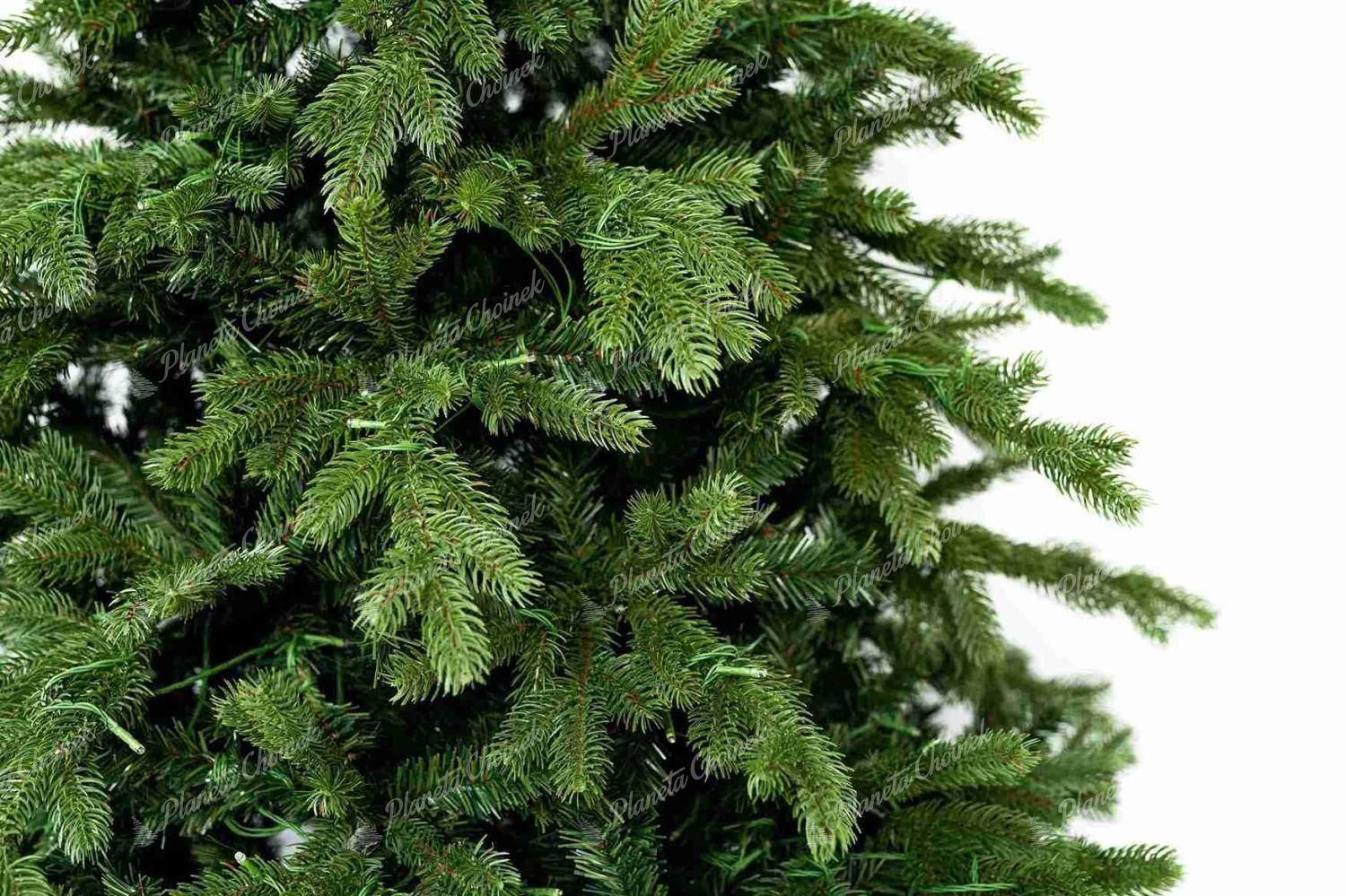 Choinka sztuczna jak żywa PE Świerk Ekskluzywny zachwyca swoim realistycznym wyglądem. Gałązki PE są rozmieszczone nieregularnie, aby maksymalnie odwzorować naturalny charakter żywego drzewka. Wzdłuż choinki znajdują się większe i mniejsze, ciemnozielone gałązki, które tworzą efektowną, gęstą strukturę.