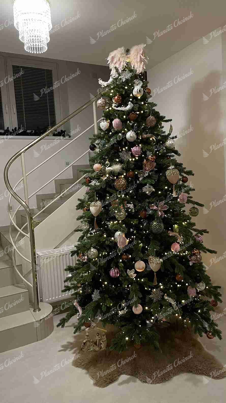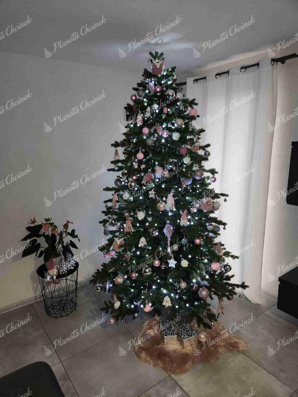 Wnętrze choinki wypełnione jest klasycznymi, zielonymi gałązkami z PVC, co dodatkowo zwiększa jej objętość i sprawia, że wygląda wyjątkowo okazale. Grubszy typ igliwia PE oraz wystające gałązki dodają choince szerokości i majestatycznego wyglądu. Starannie zaprojektowany kształt oraz unikalna kombinacja materiałów czynią tę choinkę naprawdę ekskluzywną.