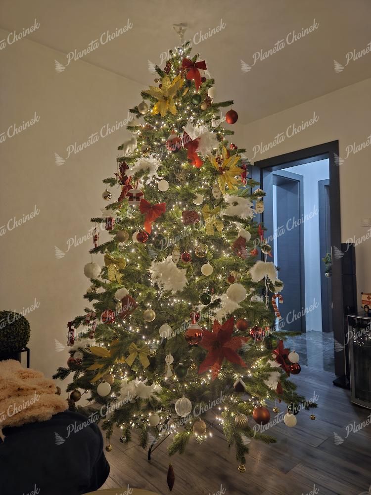 Choinka została wykonana z wysokiej jakości materiałów PVC i PE. Dzięki systemowi rozkładania w formie parasola, łatwo uzyskasz idealny kształt. Solidna, metalowa podstawa zapewnia stabilność i jest dołączona do zestawu. Istnieje również możliwość zamówienia wersji z wbudowanym oświetleniem LED – znajdziesz ją w kategorii choinki z lampkami LED.