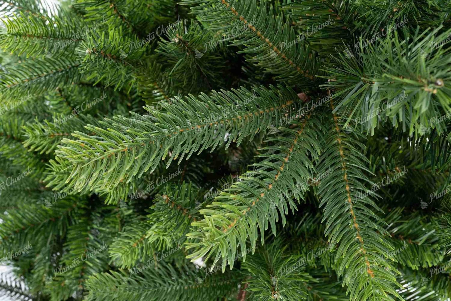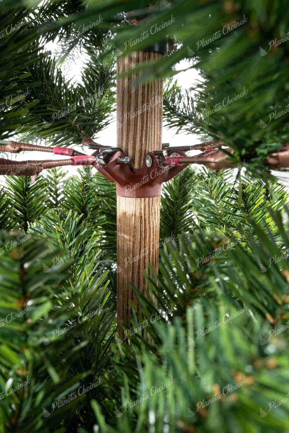 Choinka została wykonana z trójwymiarowych gałązek PE, które umieszczono na zewnętrznej stronie drzewka. Wnętrze choinki wypełniają klasyczne gałązki z PVC, które zapewniają gęstość i objętość. Efekt naturalności podkreśla również designerski pień przypominający drewno oraz drewniany stojak, który dodaje całości elegancji.