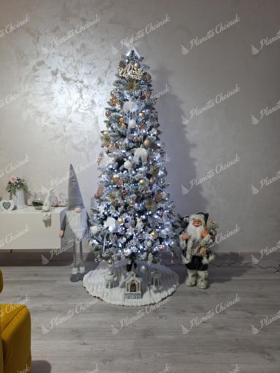 Choinka sztuczna biała wykonana jest z wysokiej jakości PVC gałązek, które zachwycają naturalnym zielonym kolorem, a ich końce pokrywa gęsty, realistycznie wyglądający śnieg. Dzięki zastosowaniu najnowszych technologii nakładania sztucznego śniegu, nie opada on z gałązek, zachowując swój urok przez długi czas.