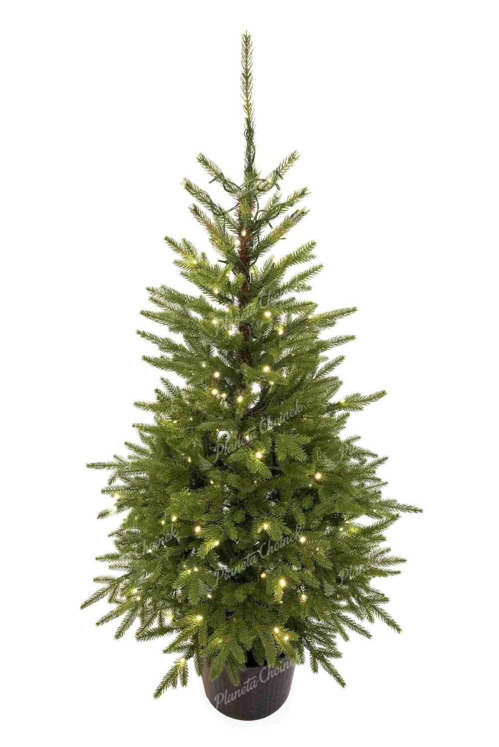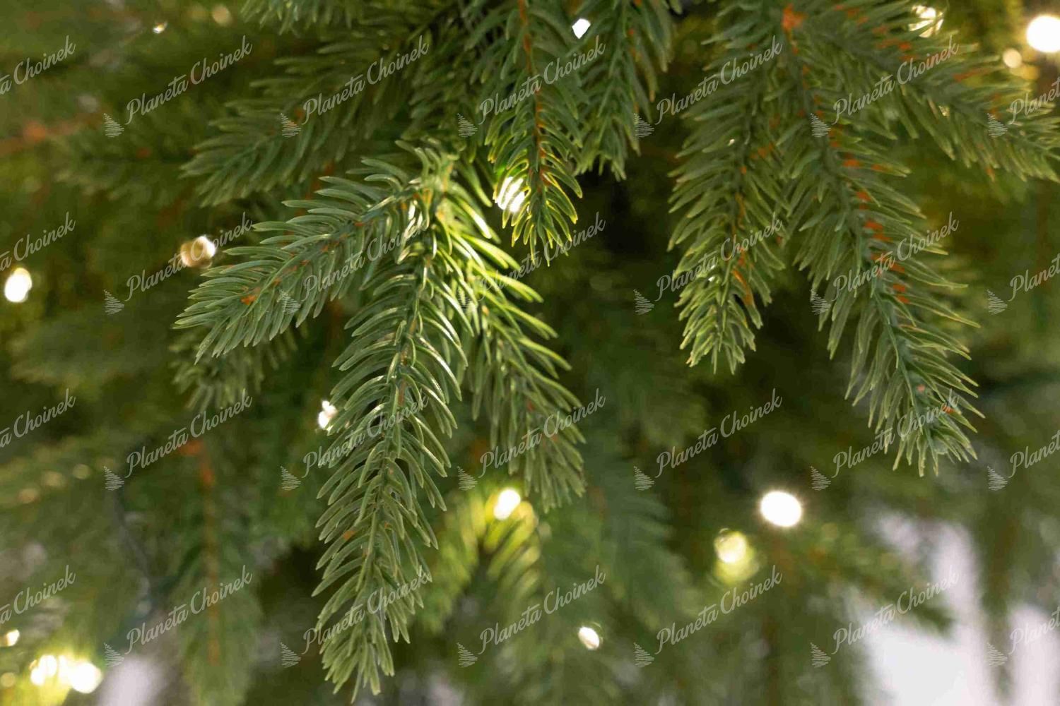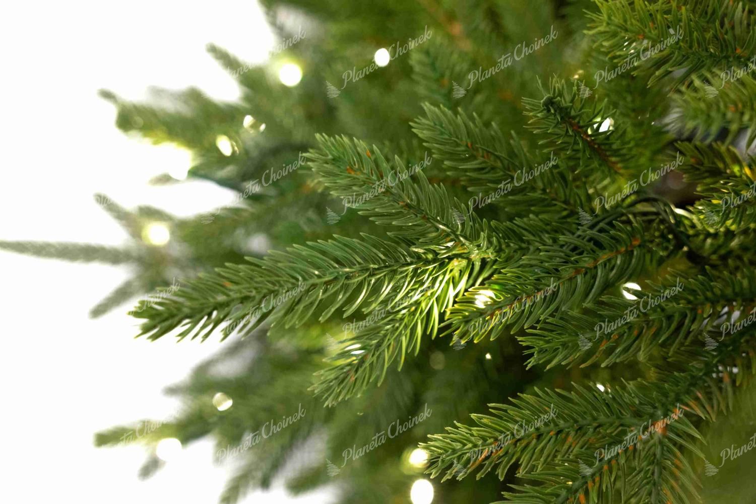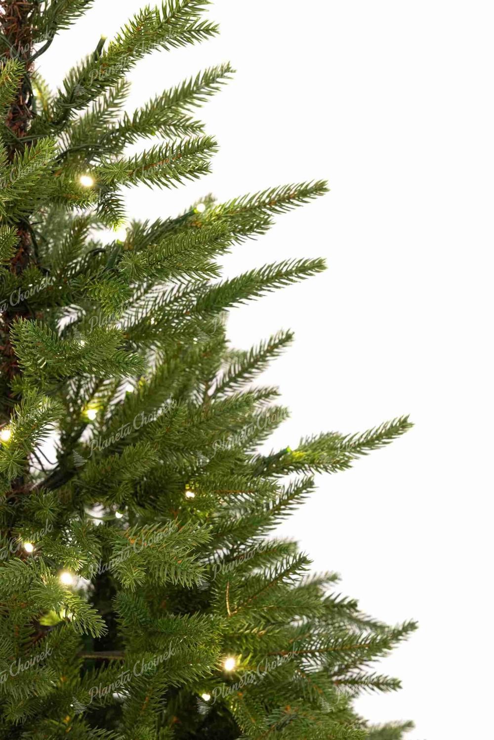 Drzewko wykonane zostało w 85% z wysokiej jakości gałązek PE o delikatnie zielonkawym odcieniu, co nadaje mu naturalny, świeży wygląd. Dzięki swojej autentycznej formie choinka cieszy się ogromną popularnością, a teraz dostępna jest również w wersji z fabrycznie zamontowanym oświetleniem LED w ciepłej bieli. Oświetlenie posiada 8 trybów świecenia, które można dowolnie przełączać przyciskiem na adapterze.