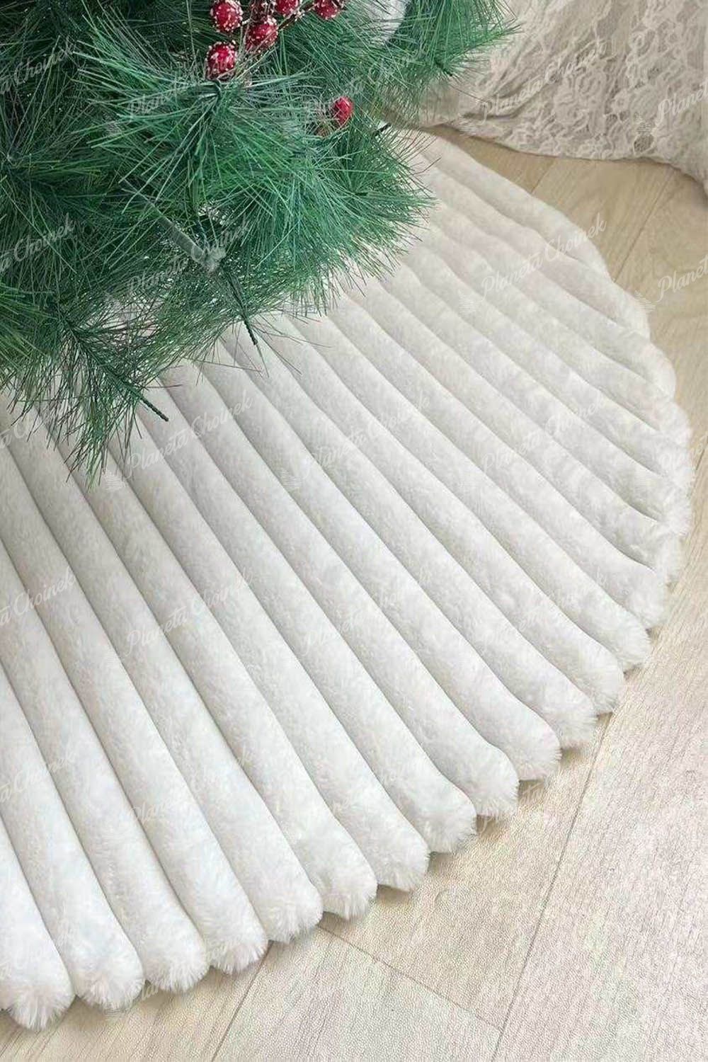 Biały dywanik pod choinkę, średnica 90 cm, kolor – biały, materiał – poliester, wykonanie – prążkowane, zapięcie – rzep, łatwe przechowywanie.
